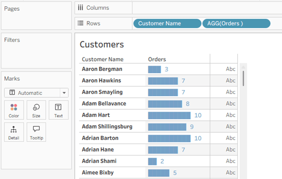 Let’s say we want to display our count of orders per customer, which is not a very large number, in bars within the table header. We create a calculated field:
