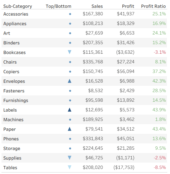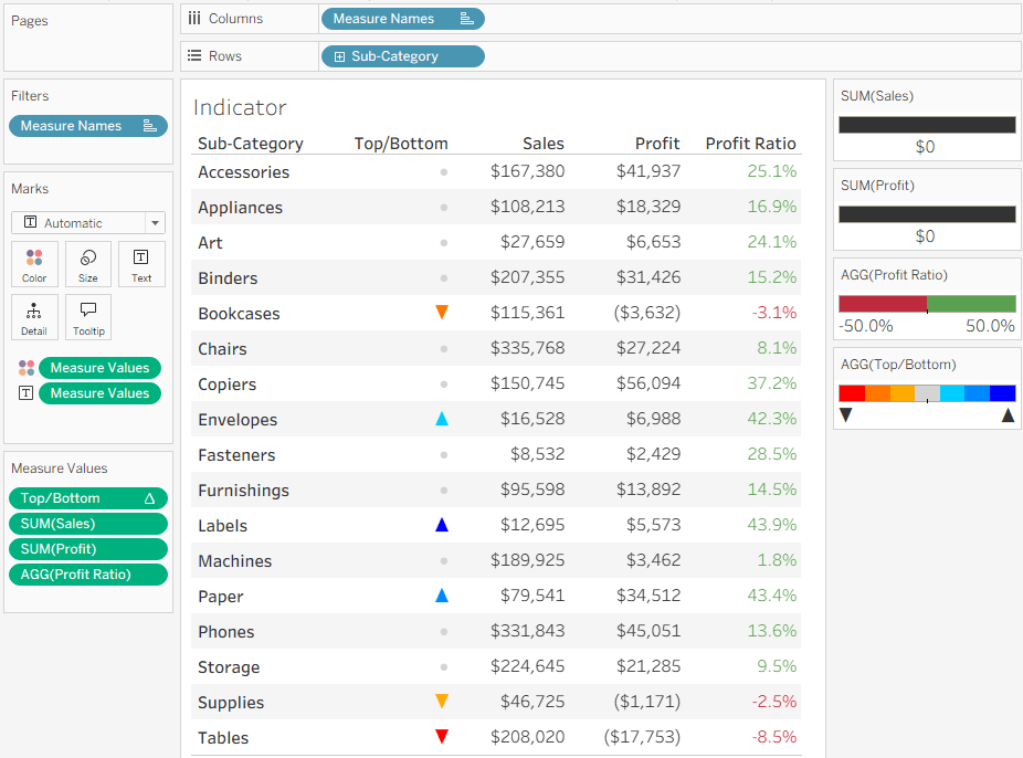 Now we want to add a colored indicator for some of the rows, based on a calculated field – I’ll take the ranking of Profit Ratio as an example. To stretch Tableau to the limits, my requirement is to display an upward pointing triangle for the top 3 rows (Sub-Categories) in Profit Ratio, a downward pointing triangle for the bottom 3, and a circle for the rest. In addition, the top 3 should be colored in shades of blue, the bottom in red, and the others in light gray. Impossible? No!