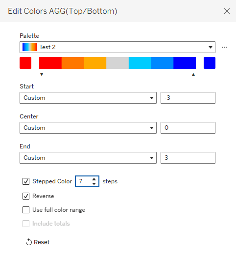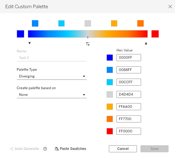Then, in addition, I can use Tableau’s color options and define a custom diverging color palette, with as many colors as I want. This is much easier in versions from 2025.3 onwards, that have the custom palette editor within Tableau, but can also be done by modifying the preferences file :