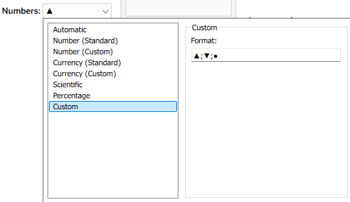 I can now leverage two of Tableau’s formatting features to create my indicators. First, the number format – I define a custom format: ▲;▼;●