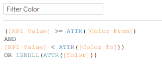 This filters the rows for each KPI so that only one “Color” row remains, and also takes into account those with no threshold values and just one row. I can drag it to the Filters card, filter by True, and drag the Color field to Color: