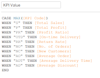 The calculation takes each row in the KPI table, and links it to a different measure, or calculated field. All the calculations have to be aggregated, otherwise you will get the dreaded “Cannot mix aggregate and non-aggregate…” error, but you can use actual calculations as well as field names, such as: