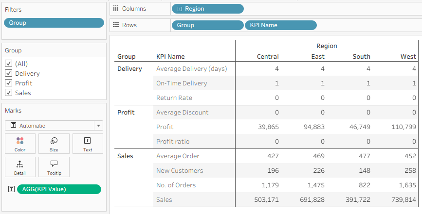 A word of warning: this is a great technique, but it’s not good for performance. The original use case had 300+ rows in the KPI table, and less than a million in the raw data, and performance dropped to 30+ seconds per view, but the analysis was so powerful that my customer was still happy with it. So use it with care, and don’t expect something that works instantaneously with Superstore data to be as fast with tens of millions of rows and 40-50 KPIs.