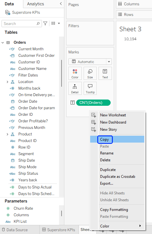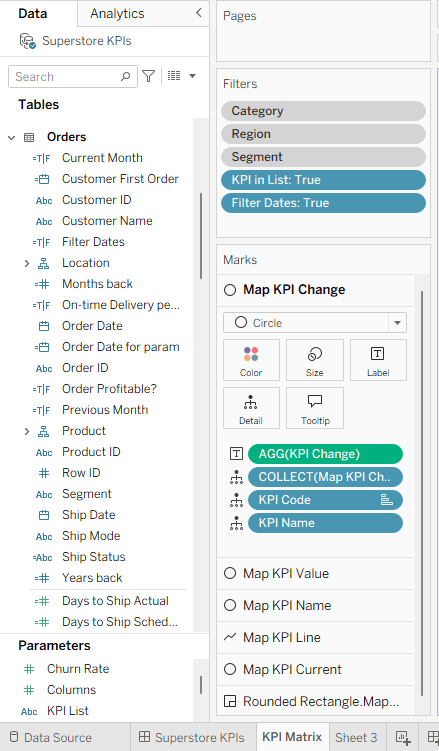 Let’s develop an example using (of course) Superstore data. I’ve created a number of calculated fields, and these will be my measures, or KPIs:
