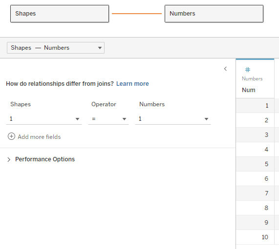 2.      Create a table of numbers from 1 to N, with N being larger than the maximum size (number of items) in your array. The table can be in Excel, the database, or any other format. Add the table to the data source and join it to the data table using a relationship, using a full cartesian join – meaning that you create a relationship calculation with an identical value (I use 1) on each side.