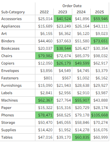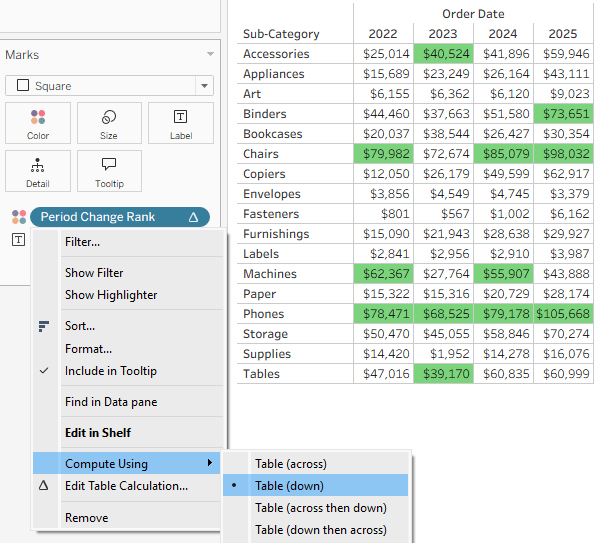 Let’s illustrate it using an example, based on Superstore data. I want to display sales by Product Sub-Category and period, and highlight the top 3 increases in sales for each period.