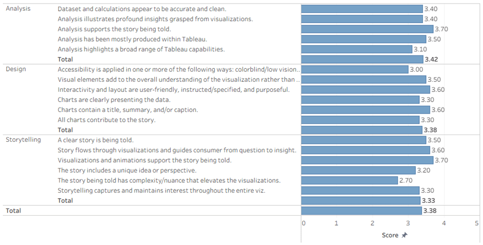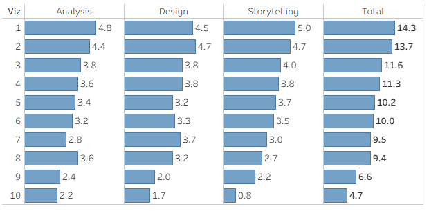We judge all the vizzes by awarding scores from 0 to 5 on the well-publicized criteria: Analysis, Design, and Storytelling. This is what the scores that I awarded looked like: